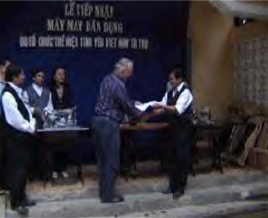 | Here you see the receiving ceremony and the sewing class in Tien Phuoc. Most of these live in the high- lands and travel over 40 km. They are provided room and board during the week and return home on the weekend. |