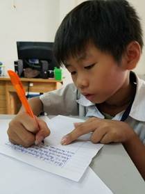 Bao Ngoc with her new glasses | Thao Vy’s mother with a parcel | A newly-sponsored boy writes a thank-you letter to sponsor | Thanh Chau with a household basket |