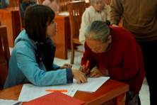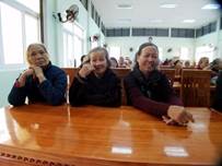 People were patiently waiting | The three happy old ladies | Signing in the list before receiving |