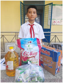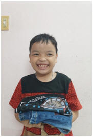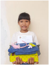 Our sponsored children show a variety in the way they pick things as their birthday gifts. Two boys Hoang Vu and Quoc Hung with school bag and clothes while the girl Tuong Vy chose dress and hair band |
